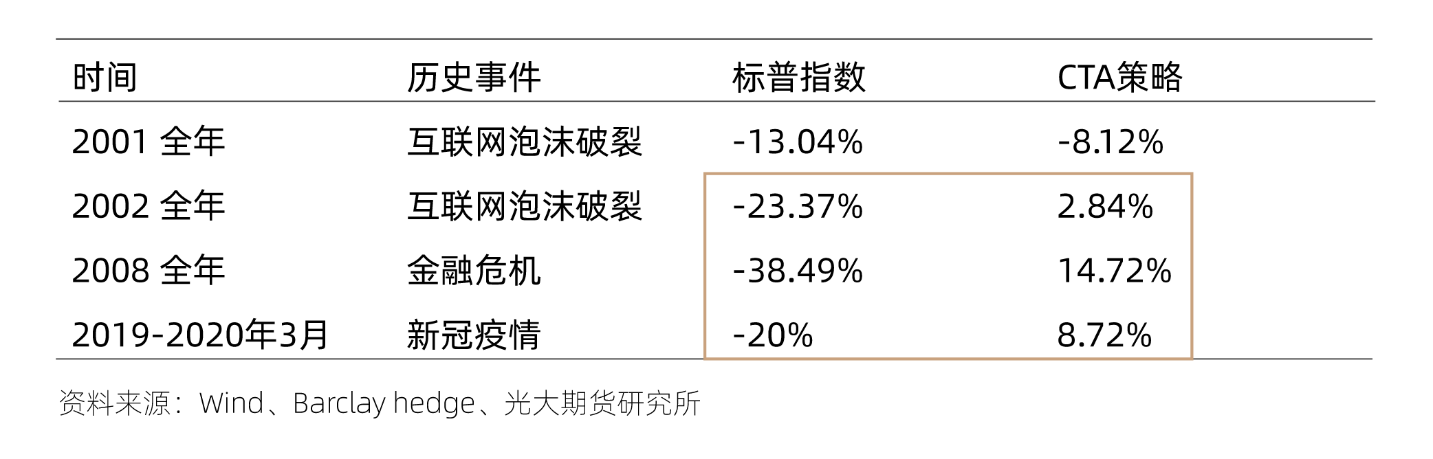 上表显示出:在一定的情况下,这种低相关性甚至阶段性地演化成了“负相关性”,即:在股票市场表现不佳的情况下,CTA策略的表现甚至逆市上扬。因此,CTA策略也被盛赞为“具有危机α属性”!