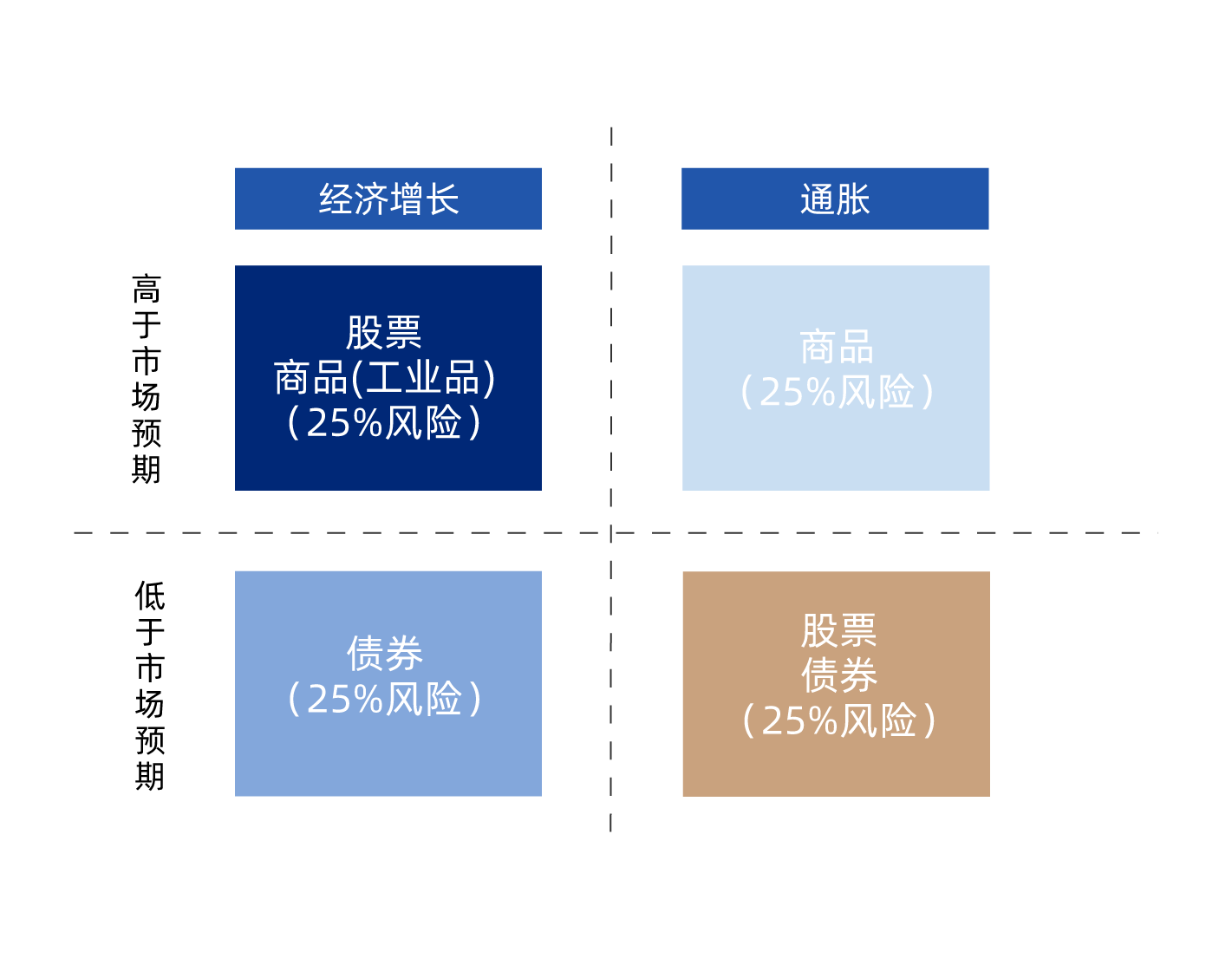 但全天候策略,作为资产配置3.0模型的代表,实现了资产配置理论和实践的重大突破。该策略基于风险平价思想进行资产配置,由桥水自1996年搭建。即基于风险平价思想,关注不同经济周期下组合内资产的风险暴露程度,将各类资产的风险暴露锚定在一个特定的水平。通过这种风险的配比而不是资产配比的方式构建组合,会让持有人承担的组合风险与预期的一致性更高,也因此持有体验更好。