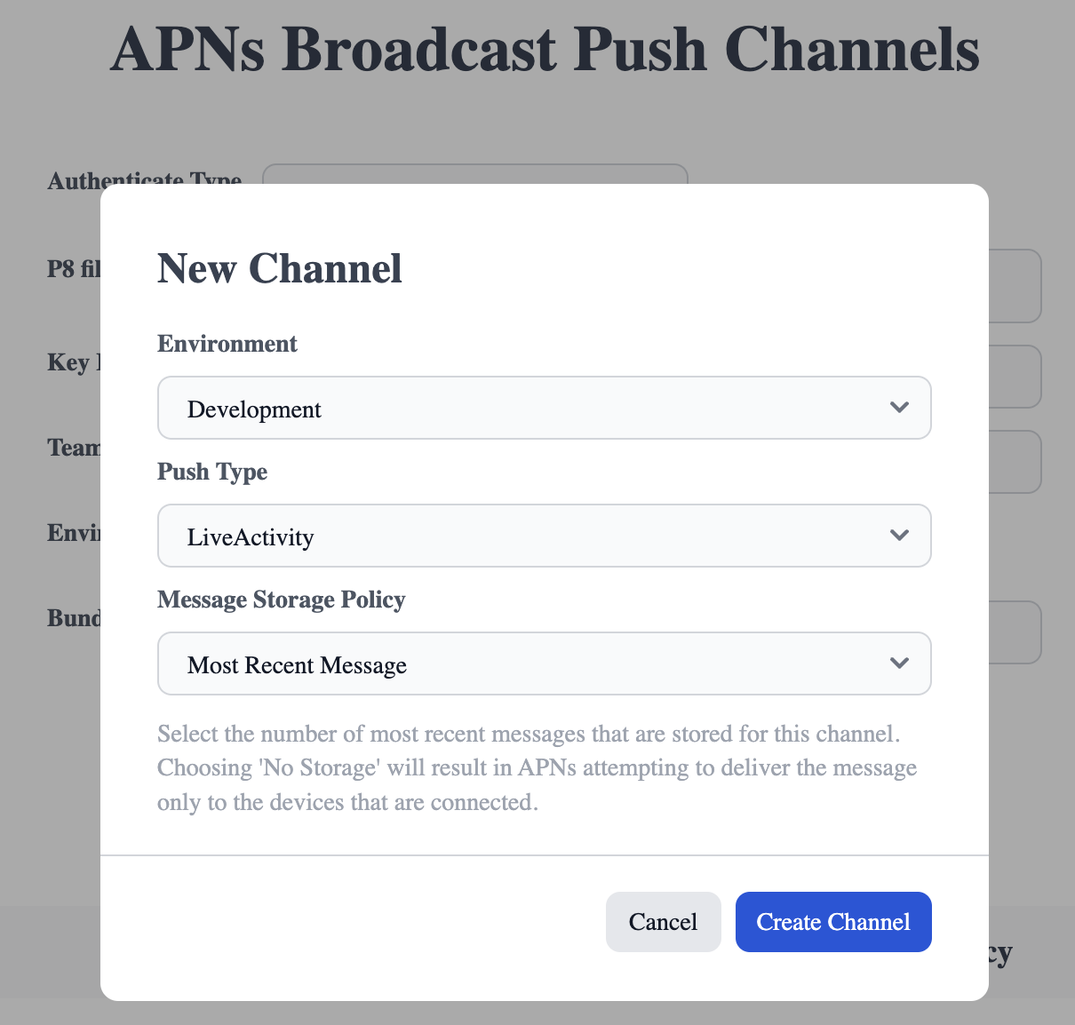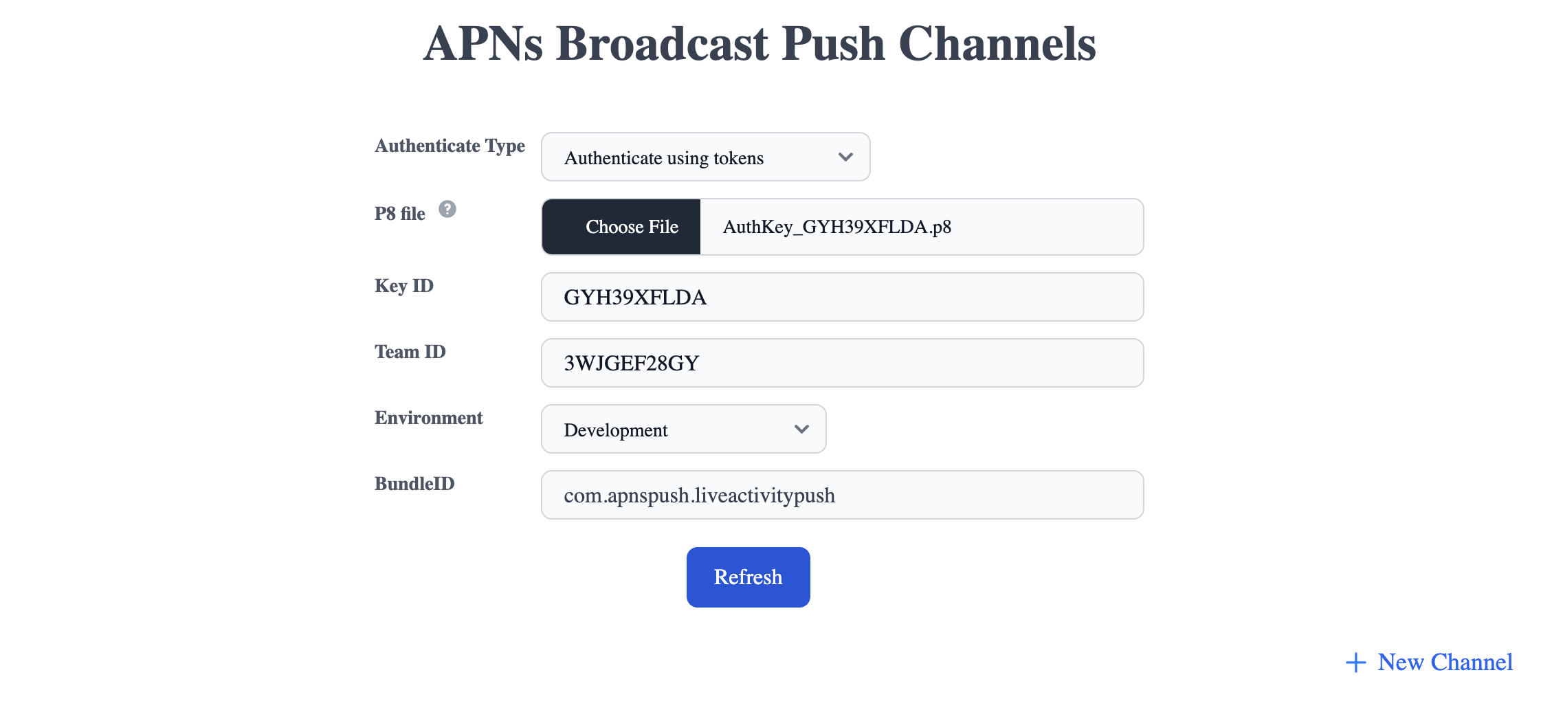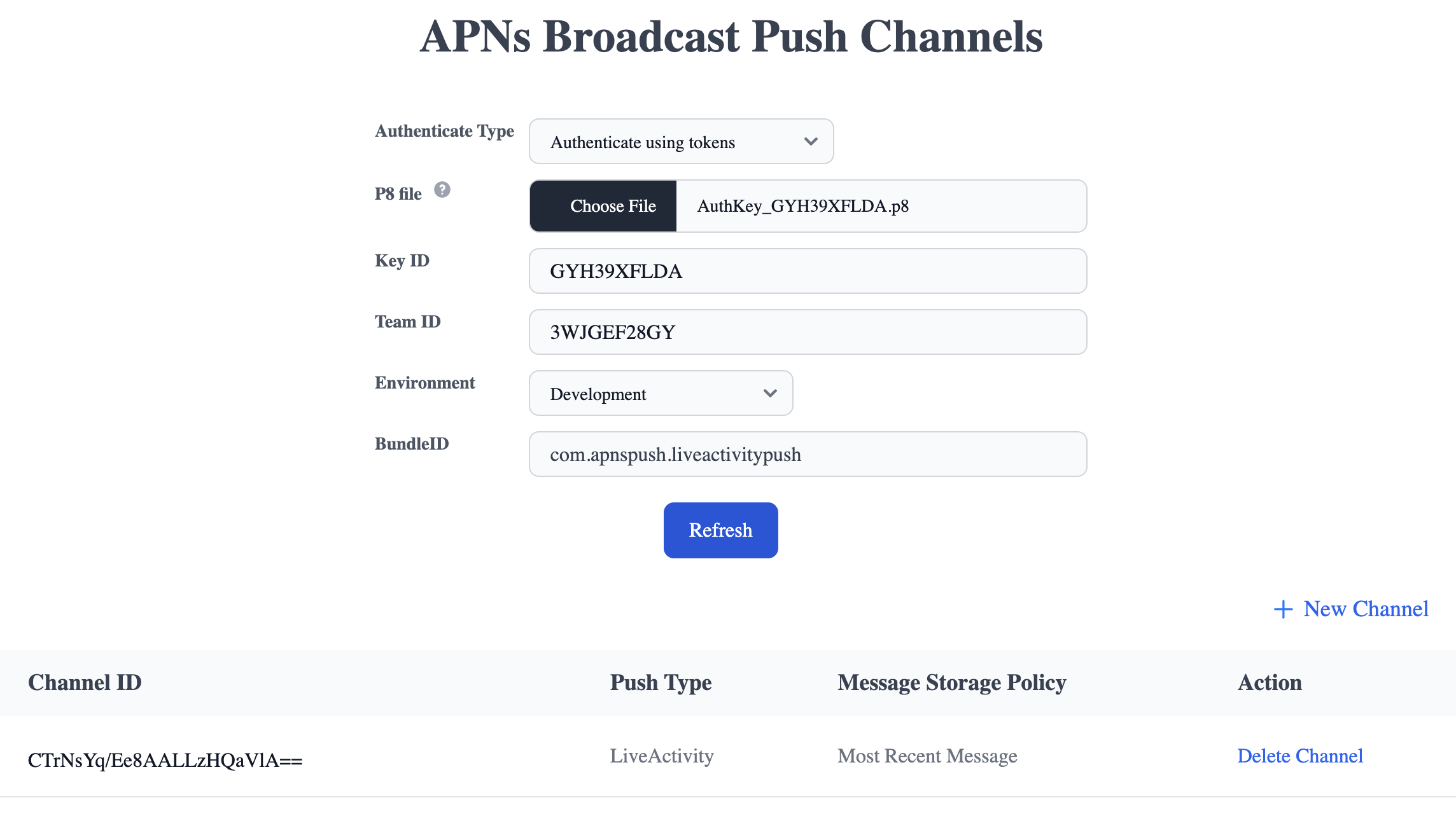 , excluding the ".push-type.liveactivity" suffix. - Click the "+ New Channel" button.